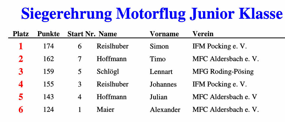 Furchtlos zeigte sich dennoch unser Alexander („Axel“) Maier, der mit seinem EasyGlider drei überragende Durchgänge hinlegte und sich damit mit erheblichem Vorsprung den ersten Platz vor Simon Feldl, Tobias Huber und Timo Hoffmann, ebenfalls vom MFC, erflog. Reiner Feldl konnte einen guten 6. Platz und Toni den 12. Platz erreichen.